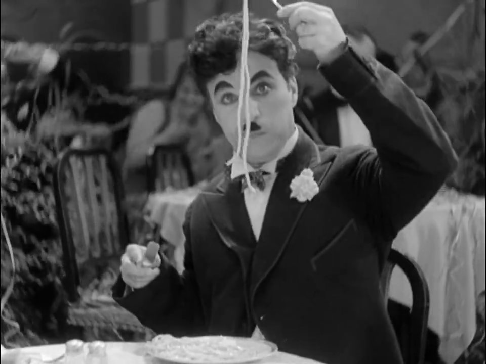 À l’écran, Charlot se débat avec un canard rôti. Monsieur Verdoux profite lâchement d’une tourte du dimanche bien mal acquise. Le Dictateur dévoile son penchant coupable pour les fraises à la crème. Quant au mécanicien des Temps modernes, il rencontre avec rudesse l’épi de maïs féroce de la machine à manger.